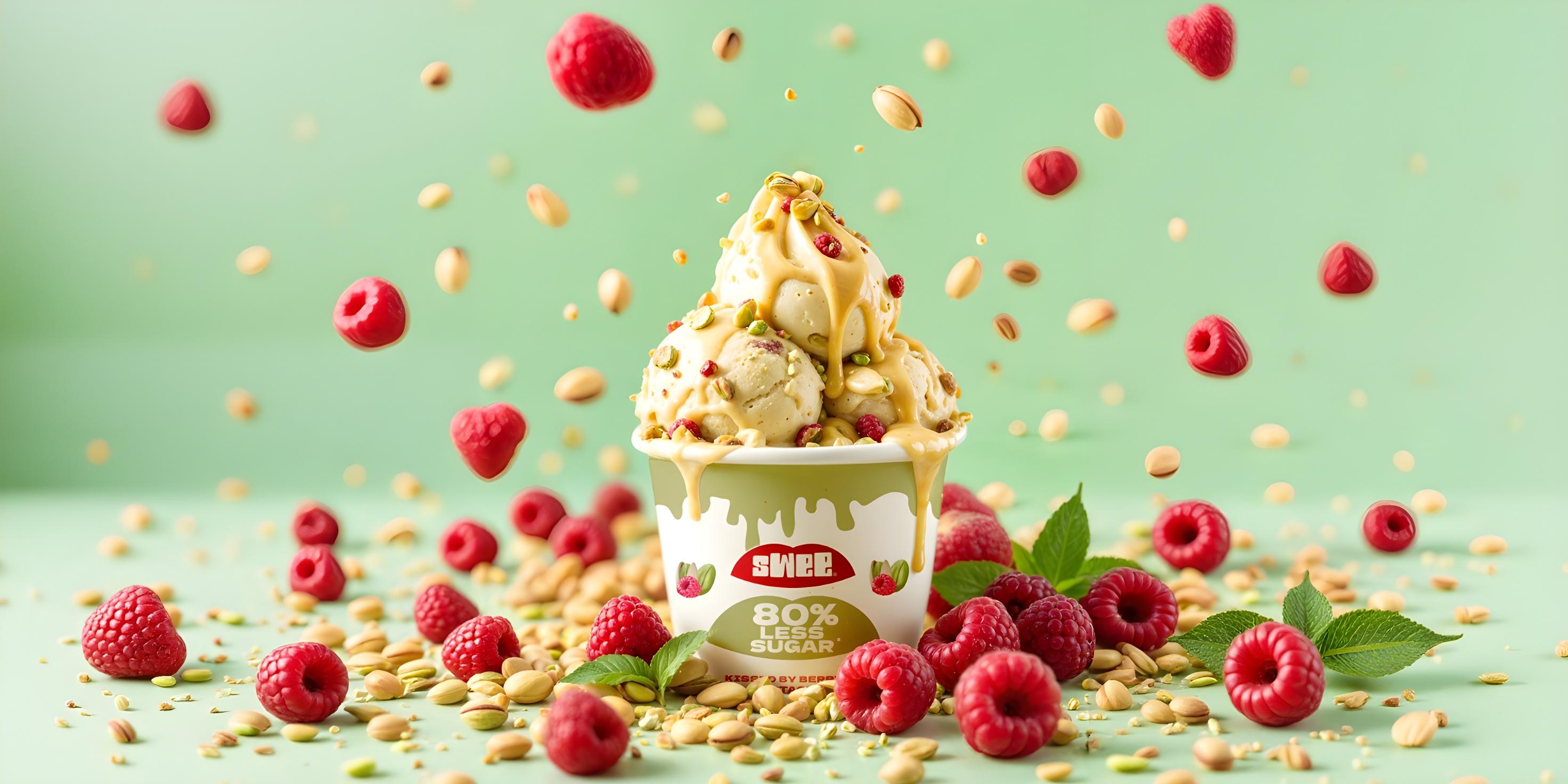 Água, aveia desidratada, pasta de pistachio 5,3% (pistachios, clorofila), framboesas, maltitol, eritritol, sorbitol, gordura vegetal de coco, amido modificado, maltodextrina, inulina, mono e diglicéridos de ácidos gordos, alginato de sódio, pectina, carragenina, goma de celulose, fosfato dipotássico, proteínas vegetais, xarope de glucose, farinha de SOJA, aromatizante natural, extrato de stevia.