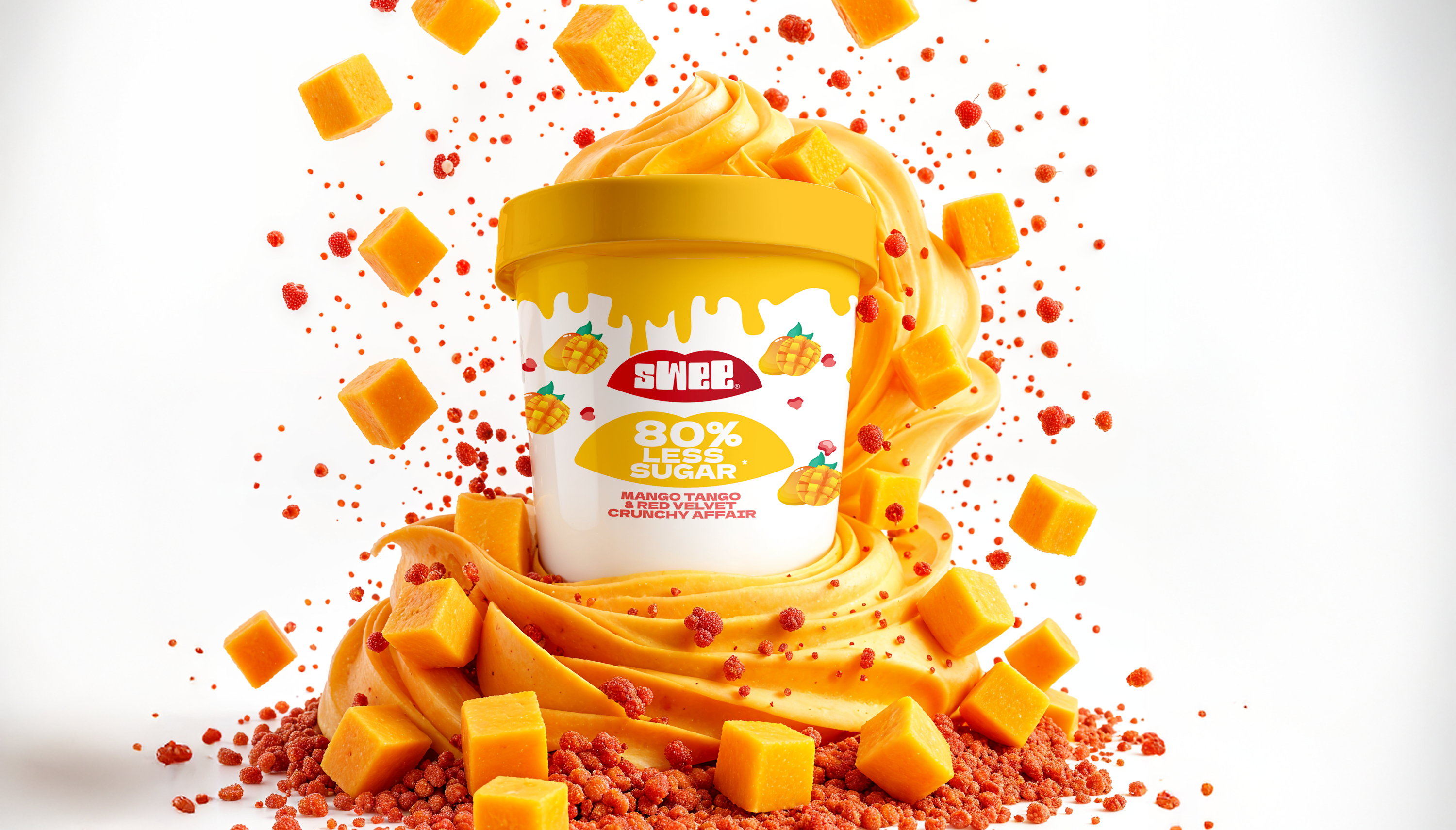 Água, aveia desidratada (33%), pedaços de bolacha (10%) [farinha de TRIGO, gordura vegetal (COCO), matitol, óleo vegetal (girassol), concentrado beterrada, aromas naturais, sal, levedantes (carbonatos de amónio, carbonatos de sódio)], pasta de manga (6%) [32% de manga, xarope de glucose-frutose, açúcar, ácido cítrico, ácido málico, aromatizantes, carotenos, extracto de paprica, pectina], maltitol, eritritol, sorbitol, gordura vegetal de COCO, amido modificado (TRIGO), maltodextrina, inulina, mono e diglicerídeos de ácidos gordos, alginato de sódio, pectina, carragenina, goma de celulose, fosfato de dipotássio, proteínas vegetais, xarope de glicose, farinha de SOJA, aroma natural, extrato de stevia.